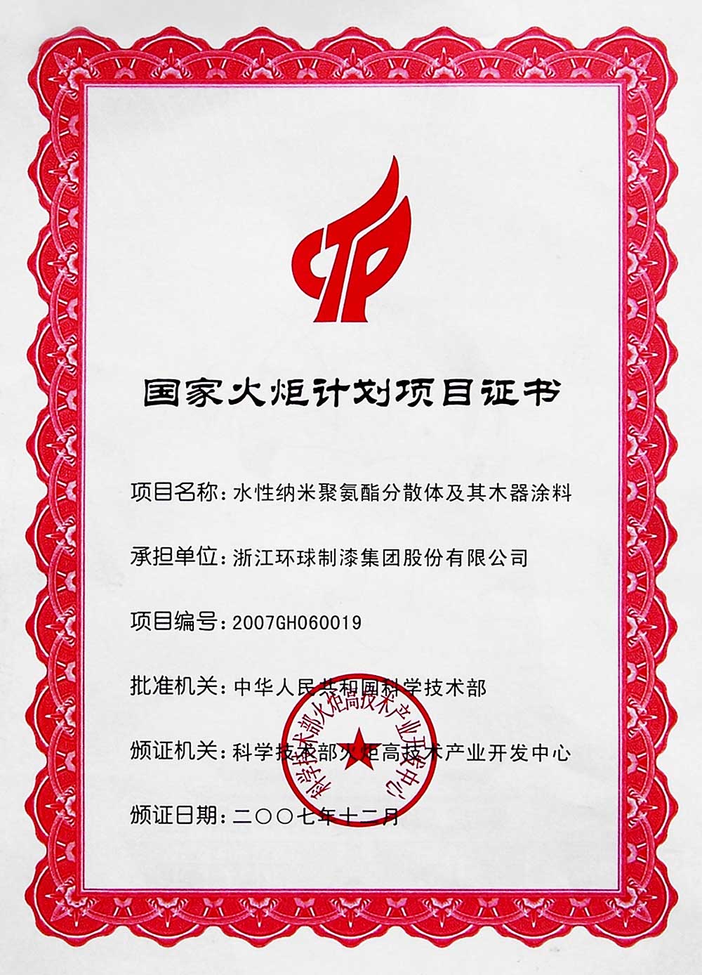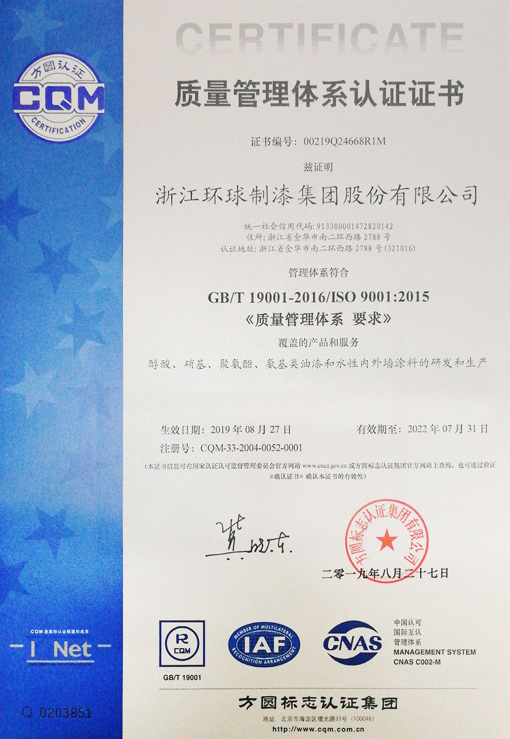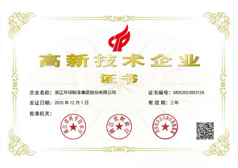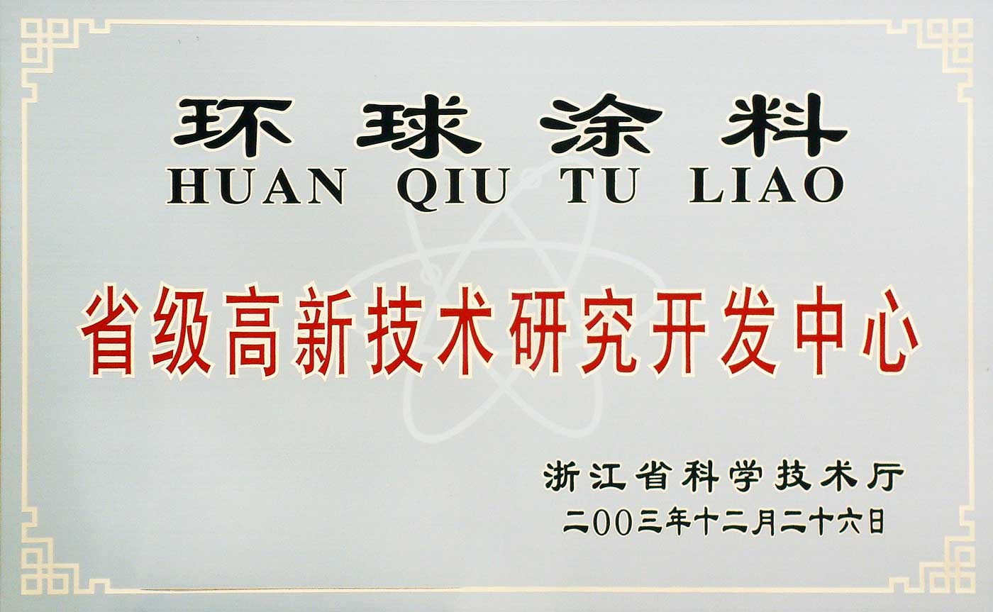 公司一貫堅持以質量求生存,以科技求發展,恪守“創精品、創優質、創名牌,為市場、為用戶、為明天”的質量方針,精益求精,不斷超越,公司始終重視科技研發,堅持技術創新,擁有較強的科研開發能力,主導產品核心技術均為企業自主研發獲得,擁有專利17項。公司通過ISO9001質量管理體系和ISO14001環境體系認證,公司還榮獲“國家高新技術企業”、“中國工業漆企業10強”、“納稅信用等級AAA級企業”等稱號,其產品榮獲“中國名優建材產品及建設工程推薦產品”、國家裝飾、裝修產品“3C”認證,“浙江名牌產品”、“浙江省著名商標”等榮譽。